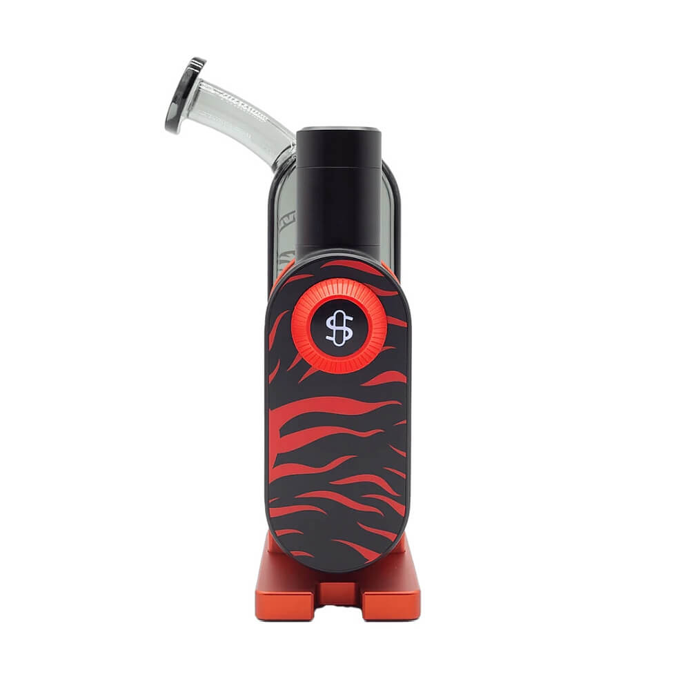The Mike Tyson x Stündenglass Modül features gray borosilicate glass with a bold white tiger graphic on one face and red and black tiger stripes on the reverse — a direct visual reference to Mike Tyson’s iconic facial tattoo and heavyweight legacy. Housed in a signature Tyson red drop-resistant travel case, this limited-edition smoking set is as much a collector’s piece as it is a high-performance device.
